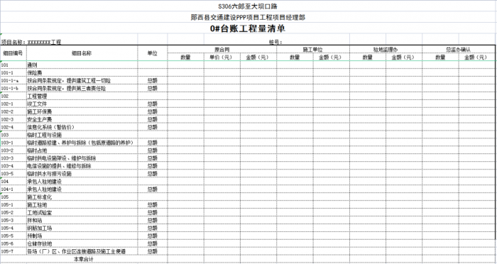 一個(gè)項(xiàng)目或一個(gè)合同段的臺(tái)賬由n條可以獨(dú)立計(jì)量的工程結(jié)構(gòu)(單元)組成,一般情況下一條臺(tái)賬應(yīng)包含子目號(hào)、子目名稱、單位、工程數(shù)量、單價(jià)、合價(jià)、里程樁號(hào)、工程部位描述、圖紙編號(hào)、備注說明等。